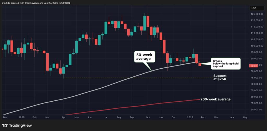 Volgende steunlevels in zicht: $75.000 en $58.000